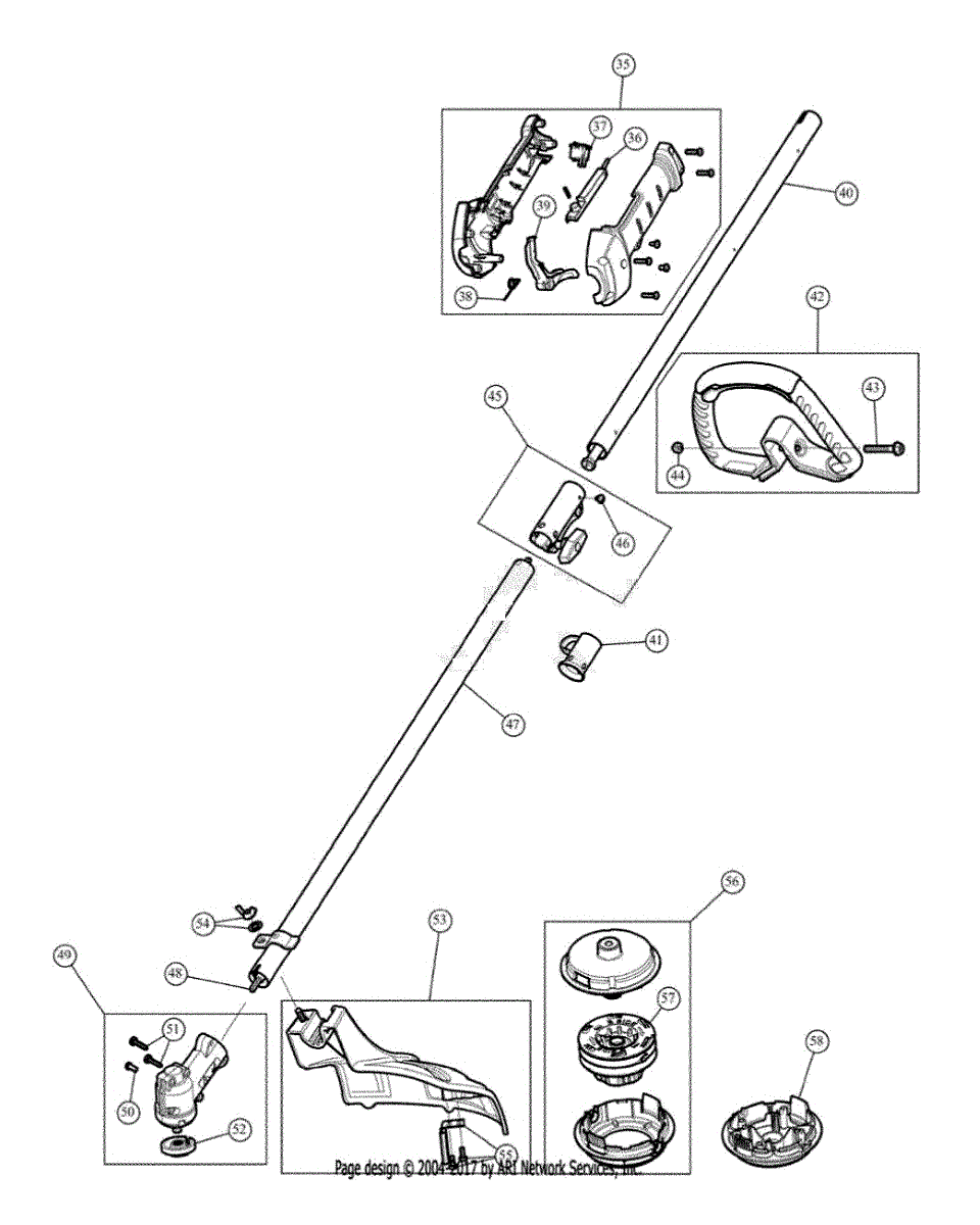 Upper boom assembly for gas line trimmers. Connects the engine housing to the cutting head. Replace if cracked, bent, or structurally damaged.