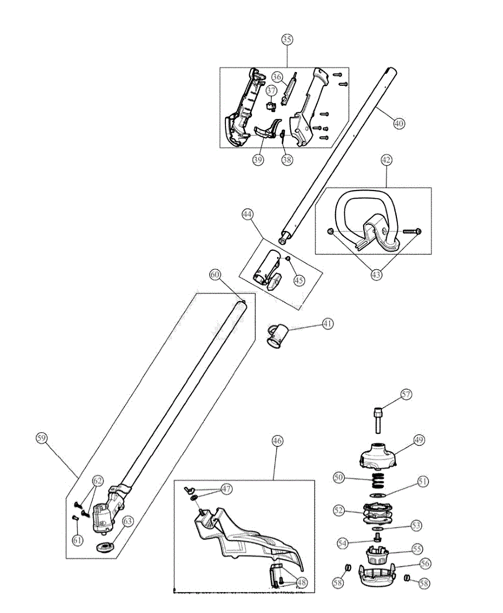 Upper boom assembly for gas line trimmers. Connects the engine housing to the cutting head. Replace if cracked, bent, or structurally damaged.
