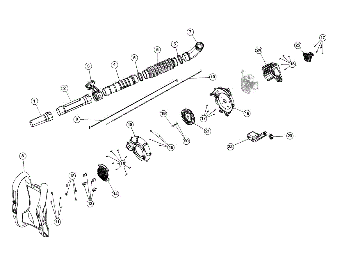 Backpack nozzle for gas leaf blowers. Directs airflow for clearing debris. Replace if cracked, broken, or missing to restore proper blowing function.