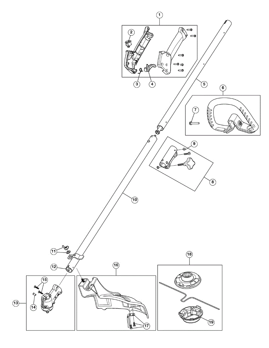 Upper boom assembly for gas line trimmers. Connects the engine housing to the cutting head. Replace if cracked, bent, or structurally damaged.