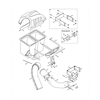 Upper chute assembly for riding lawn mower bagging systems. Guides cut grass from deck to collection bag. Replace if cracked, broken, or damaged.
