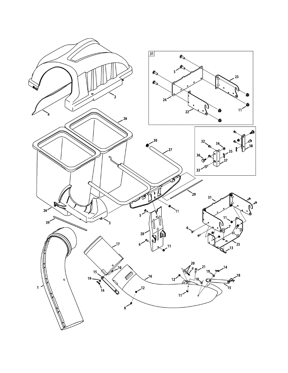 Upper chute assembly for riding lawn mower bagging systems. Guides cut grass from deck to collection bag. Replace if cracked, broken, or damaged.