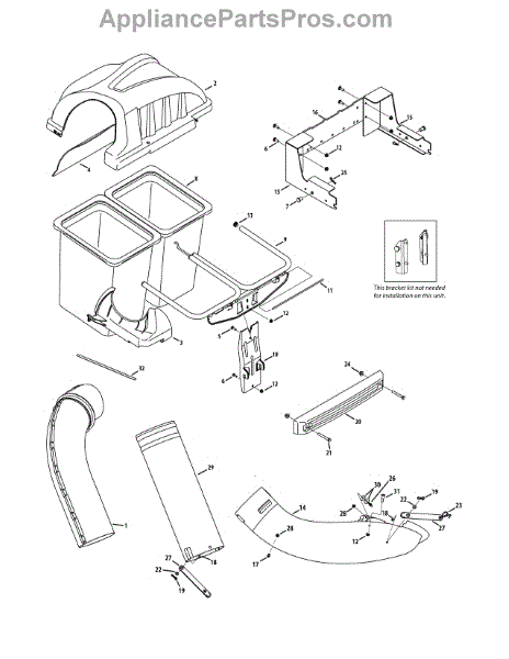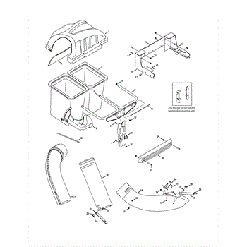 This upper chute assembly is part of a riding lawnmower bagging system. As the grass is mowed, it is pulled up and through the upper chute, where it is deposited in the grass bag. This is an OEM replacement part sourced directly from the manufacturer. If the upper chute has become damaged due to age or exposure to the elements, this part should be installed to repair the lawnmower.If the upper chute is damaged, grass clippings may not be fully bagged. Cracks in the chute can reduce efficiency, and some of the clippings may remain on the ground or eventually clog the tube. If the bag doesn't appear to be catching clippings after mowing, the upper chute assembly should be inspected. To repair the upper chute assembly, remove the machine's bagger and locate the damaged upper chute. Remove the damaged upper chute and dispose of it. Install the new upper chute and replace the mower bag. This upper chute assembly is a black plastic molded part that is sold individually. It is designed for use on lawnmowers manufactured by MTD and Craftsman.