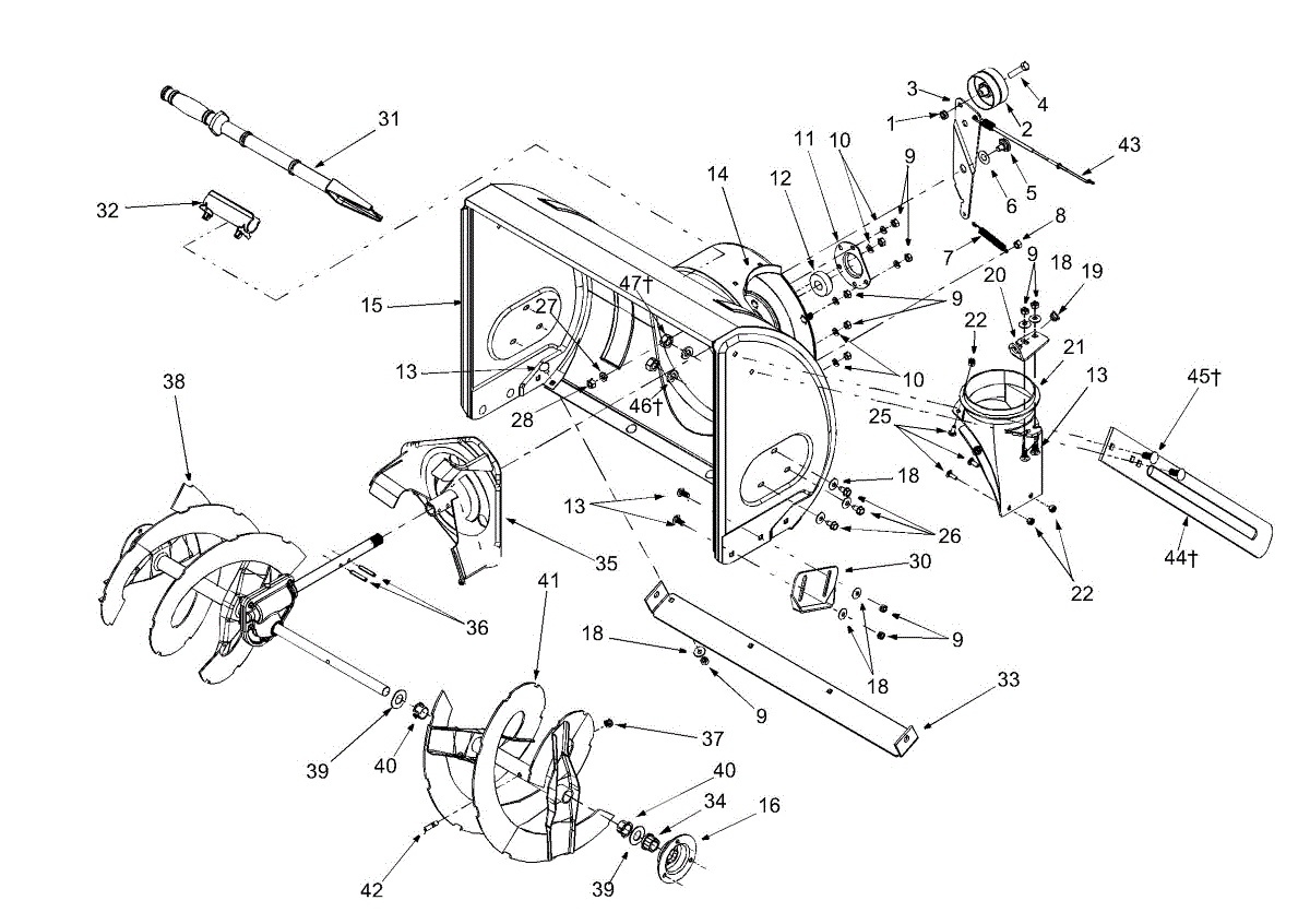 Auger housing assembly for snowblowers. Encloses and protects the auger mechanism. Replace if cracked, damaged, or rusted. Fits 26-inch models.