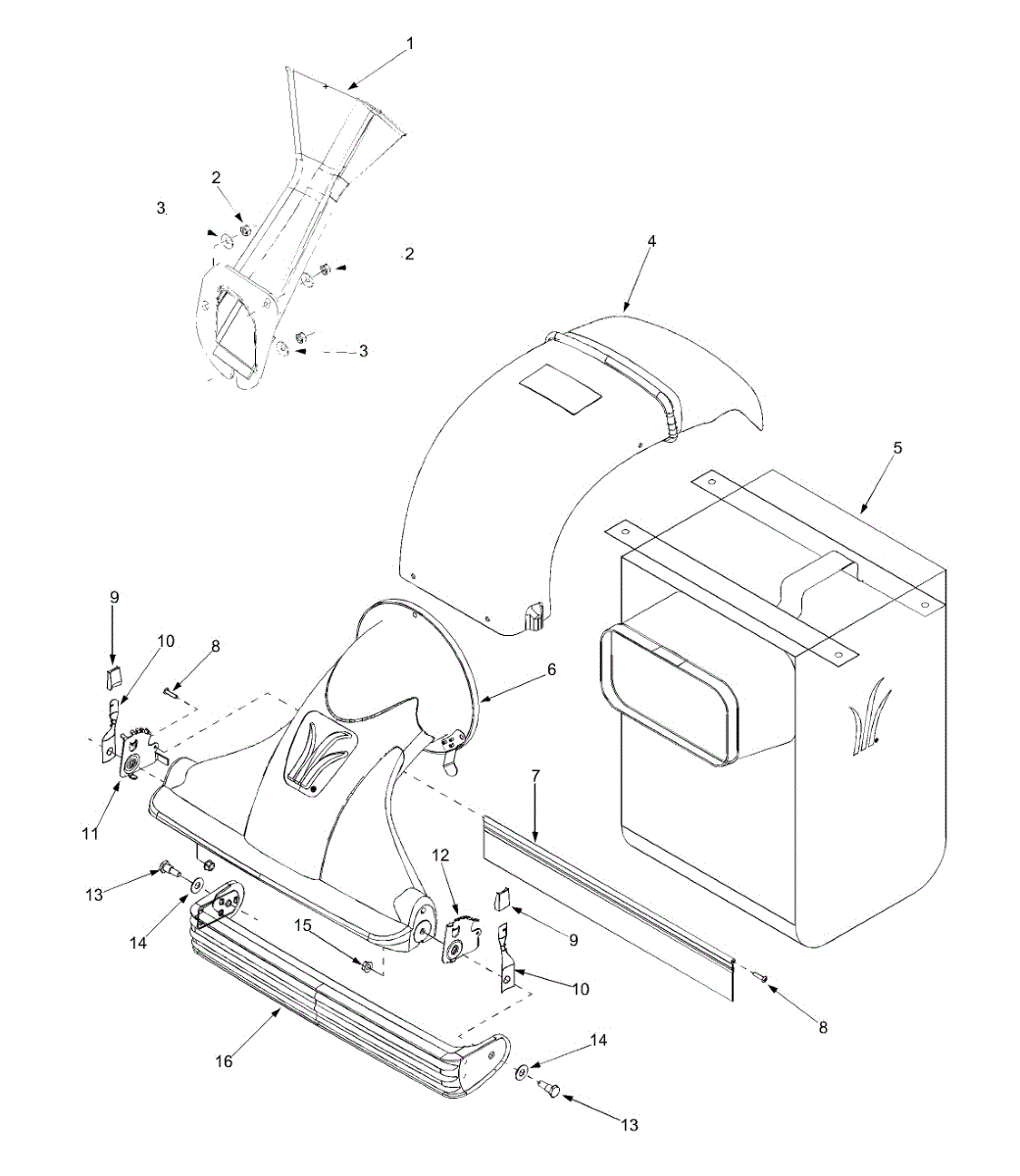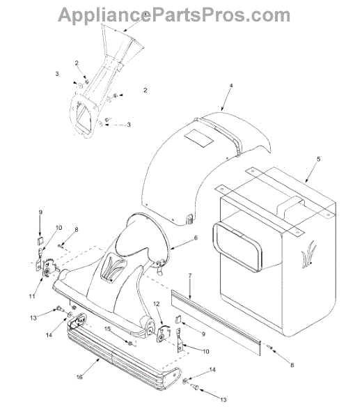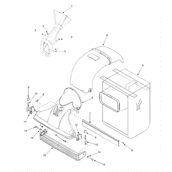 Complete chute assembly for chipper shredders. Directs wood chips and debris into collection bag. Replace if cracked, broken, or missing components.
