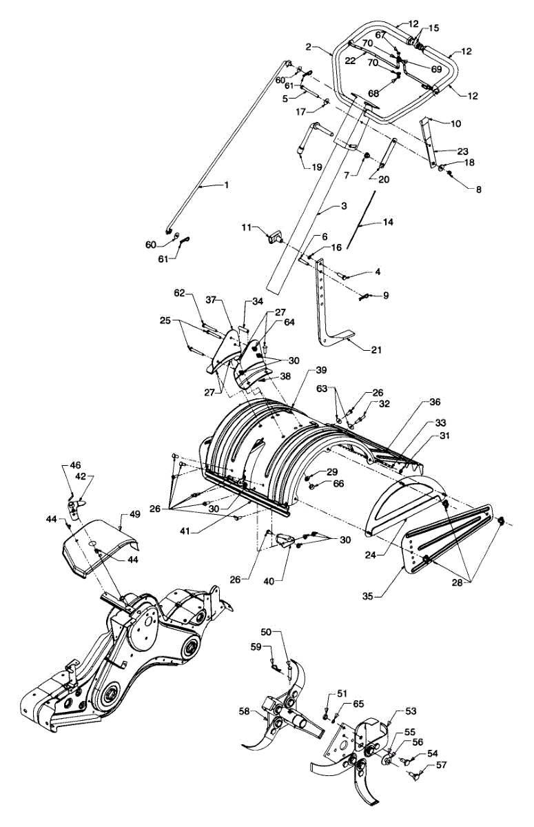 Replacement debris guard flap for rear-tine tillers. Shields operator from flying rocks and soil. Replace if torn, cracked, bent, or missing.