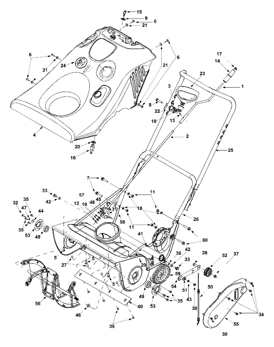 Protects drive belts from debris and weather damage. Replace if cracked, broken, or missing to prevent belt wear and snow/dirt intrusion. Verify fit with your model.