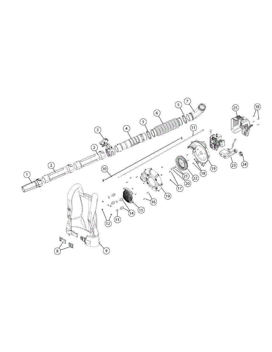 Backpack nozzle for gas leaf blowers. Directs airflow for clearing debris. Replace if cracked, broken, or missing to restore proper blowing function.