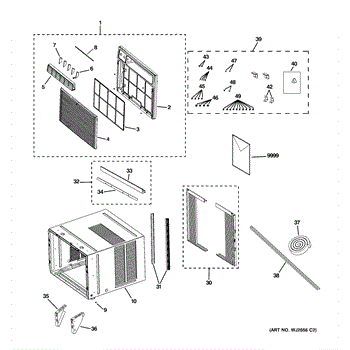 This is the air filter assembly for select GE room air conditioners. It traps dust and lint before they reach the evaporator coil, helping maintain airflow and cooling performance.