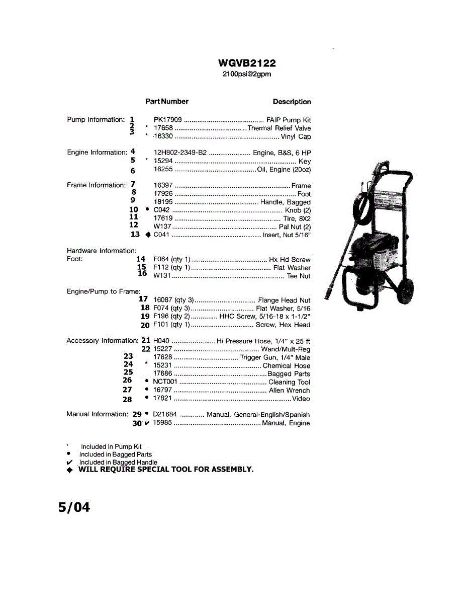 Parts for Devilbiss WGVB2122: Handle / Engine / Tire / Frame Parts