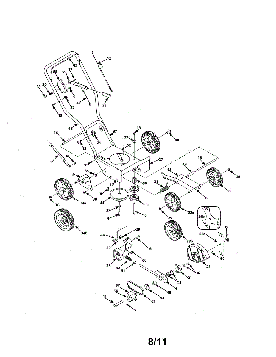 Replacement wheel assembly for walk-behind mowers and lawn equipment. Installs on axle to restore mobility. Order when wheel is cracked, broken, or worn.
