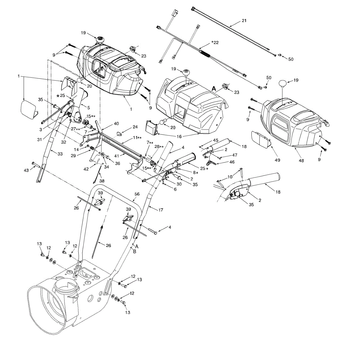 Handle panel assembly for gas snowblowers. Mounts to control area of machine. Replace if cracked, broken, or damaged from impact or wear.