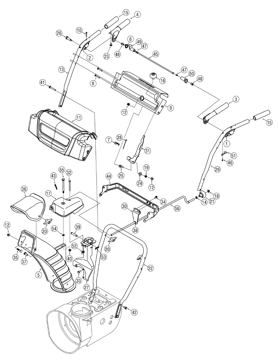 Right-side handle assembly for gas snowblowers. Replace if your original handle is cracked, bent, broken, or missing. Mounts to the frame for operator control.