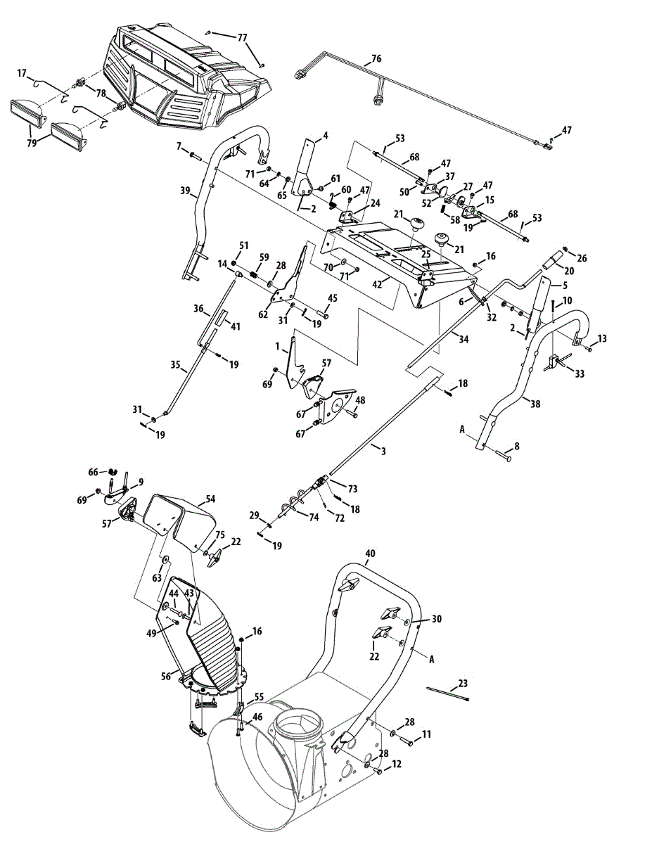 Upper discharge chute for snowblowers and edgers. Channels and directs snow or debris away from the machine. Replace if cracked, broken, or missing.