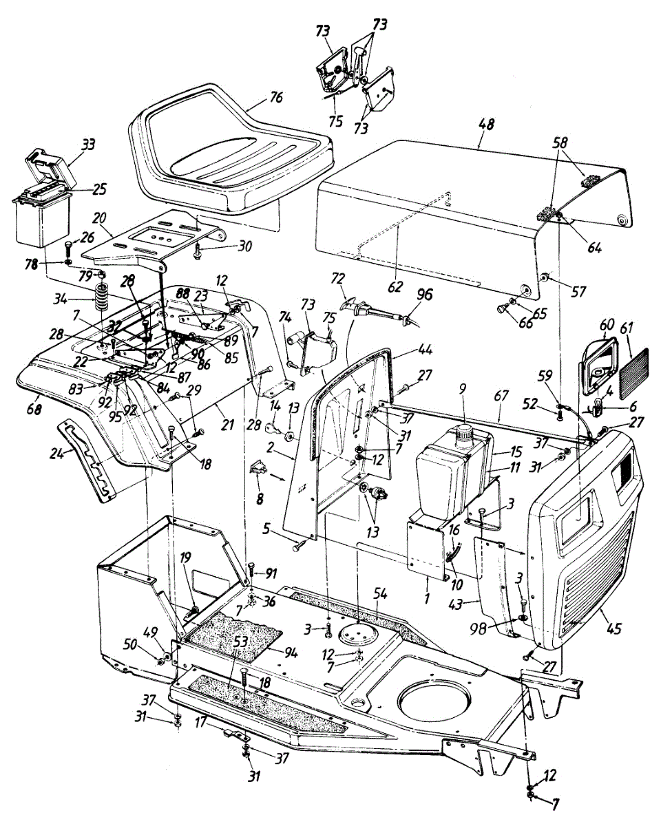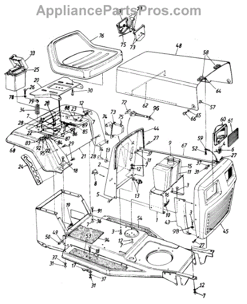 Parts for Mtd 135C472E000 / 1995: Hood / Seat / Battery / Fender / Dash Panel / Fuel Tank / Grille Parts