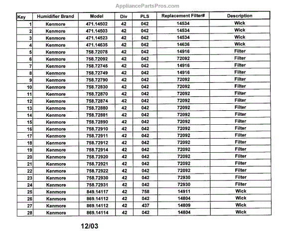 Parts for Kenmore 758.72749 (75872749, 758 72749): Humidifier Parts