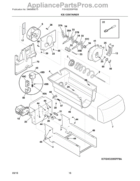 The Ice Container Assembly is an OEM part for Frigidaire refrigerators. This part collects and holds the ice produced by the icemaker.