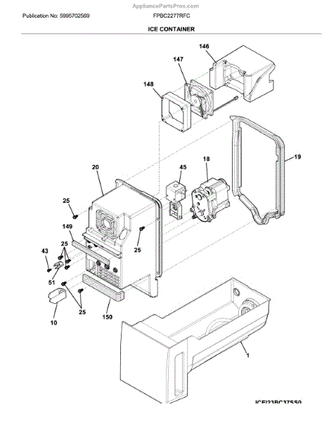 This ice container assembly catches and stores ice made by the freezer ice maker, keeping cubes contained and ready for dispensing or removal. Replacing a cracked or damaged container restores proper ice storage and delivery. What it does: