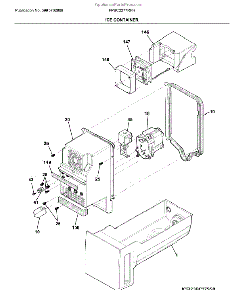 This ice container assembly catches and stores ice made by the freezer ice maker, keeping cubes contained and ready for dispensing or removal. Replacing a cracked or damaged container restores proper ice storage and delivery. What it does: