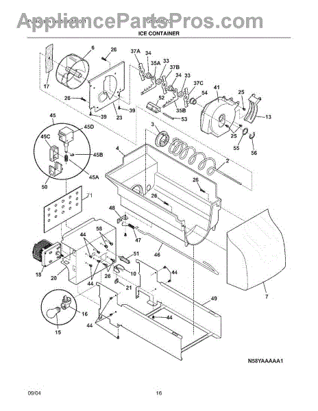 The Ice Container Assembly is an OEM replacement part for Frigidaire refrigerators that stores ice made by the ice maker. It includes the container, auger for ice dispensing, and other mechanisms for storage and dispensing.