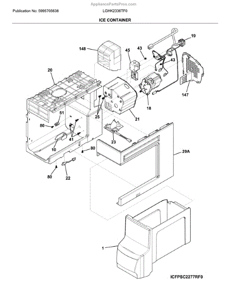 The Ice Container Assembly is an OEM part for Frigidaire refrigerators. This part stores ice produced by the icemaker, providing a convenient and accessible location for ice storage within the freezer.