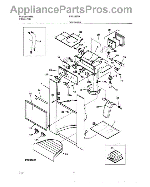 Fixes ice buildup around water dispenser spout. This throat heater prevents freezing in the dispenser area. Moderate DIY repair, 30-45 minutes.