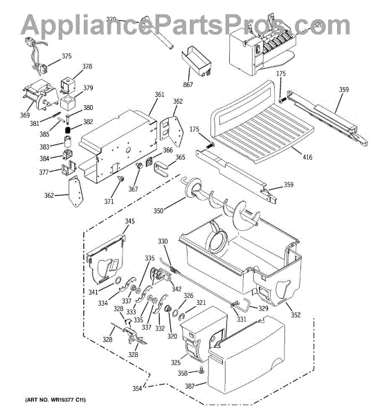 The Bucket Auger is an OEM replacement part for GE refrigerators. It is located inside the ice bucket and is responsible for moving ice from the storage compartment to the dispenser chute when you select ice dispensing. The auger rotates to transport ice cubes or crushed ice to the dispenser, ensuring smooth and efficient operation.