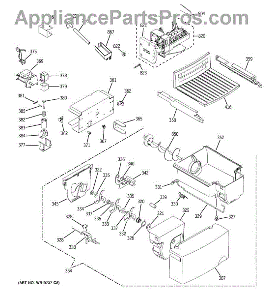 The Ice Bucket & Auger is an OEM replacement part for GE refrigerators. This assembly includes both the ice bucket and the auger, which work together to store and dispense ice. The ice bucket holds the ice, while the auger moves the ice from the bucket to the dispenser when you request ice from the refrigerator's front panel. Symptoms of a bad Ice Bucket & Auger include: