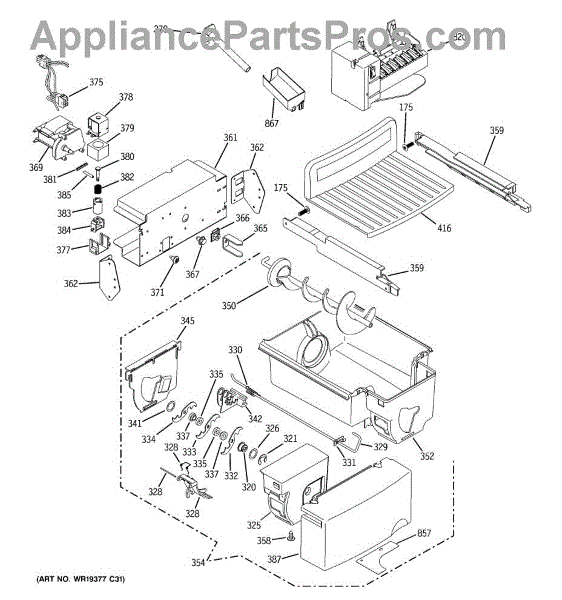 The Bucket Auger is an OEM replacement part for GE refrigerators. It is located inside the ice bucket and is responsible for moving ice from the storage compartment to the dispenser chute when you select ice dispensing. The auger rotates to transport ice cubes or crushed ice to the dispenser, ensuring smooth and efficient operation.
