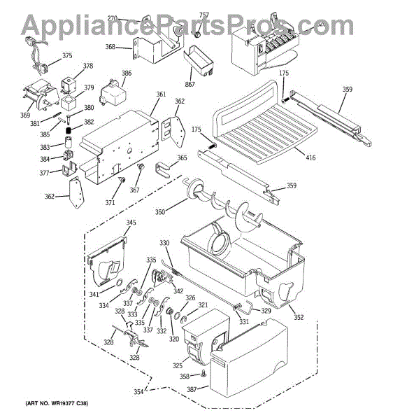 The Bucket Auger is an OEM replacement part for GE refrigerators. It is located inside the ice bucket and is responsible for moving ice from the storage compartment to the dispenser chute when you select ice dispensing. The auger rotates to transport ice cubes or crushed ice to the dispenser, ensuring smooth and efficient operation.
