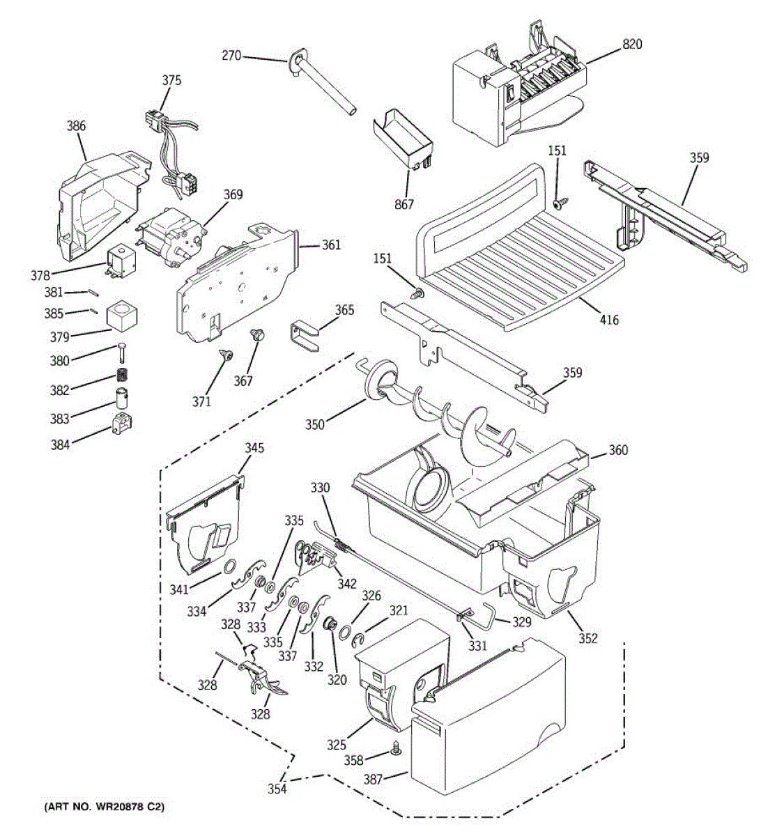 Complete ice bucket and auger assembly that stores ice in the freezer and moves it to the dispenser. Replace if cracked, broken, or jammed.