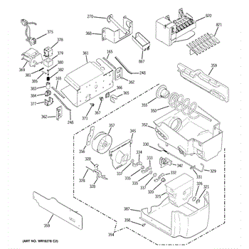 This ice bucket and auger assembly stores ice in the freezer and drives it to the dispenser chute. Replacing a cracked bin or worn auger restores smooth, dependable dispensing of cubed or crushed ice from the door.