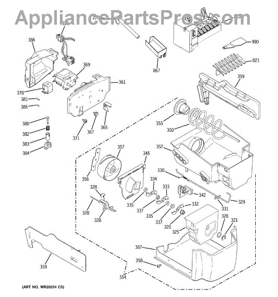 This ice bucket and auger assembly stores ice in the freezer and drives it to the dispenser chute. Replacing a cracked bin or worn auger restores smooth, dependable dispensing of cubed or crushed ice from the door.