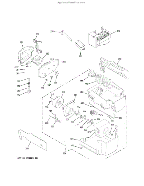 This ice bucket and auger assembly stores ice in the freezer and drives it to the dispenser chute. Replacing a cracked bin or worn auger restores smooth, dependable dispensing of cubed or crushed ice from the door.
