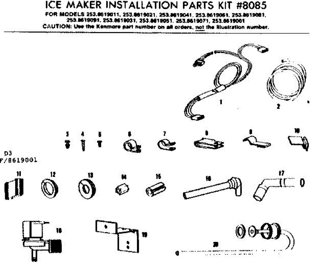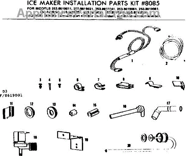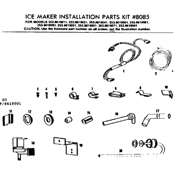 Parts for Kenmore 253.8619011 (2538619011, 253 8619011): Ice Maker Installation Parts Kit No. 8085 Parts
