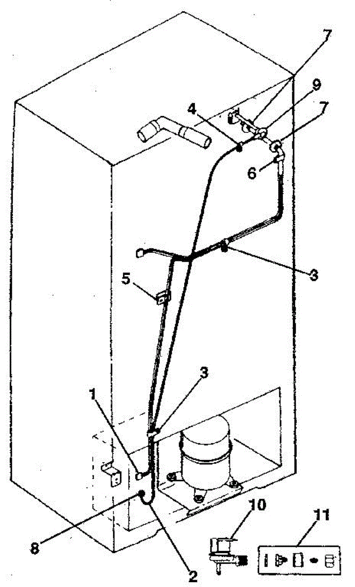 Water fill tube that directs water from the supply line into the ice maker. Replace if cracked, frozen, or the connection point is damaged or broken.
