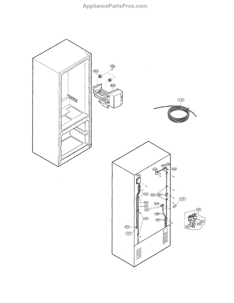 Plastic water supply tube for refrigerators. Connects water inlet to ice maker or dispenser. Replace if cracked, kinked, leaking, or damaged.