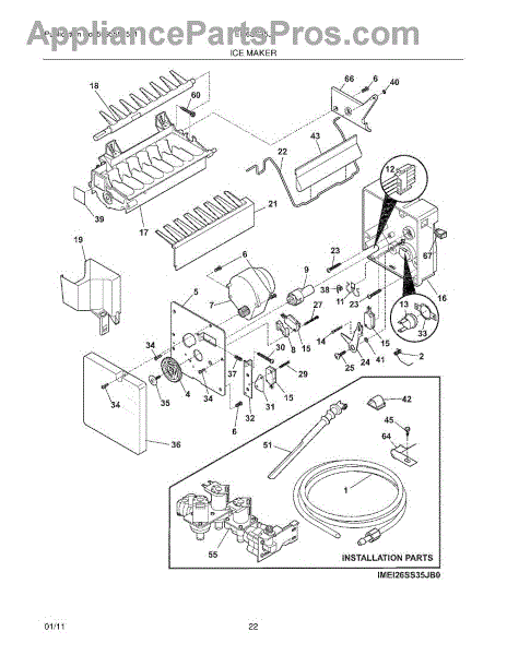 Replaces cracked, leaking, or melted ice maker fill tube that carries water from the supply line to the ice mold. Installs in the freezer compartment.