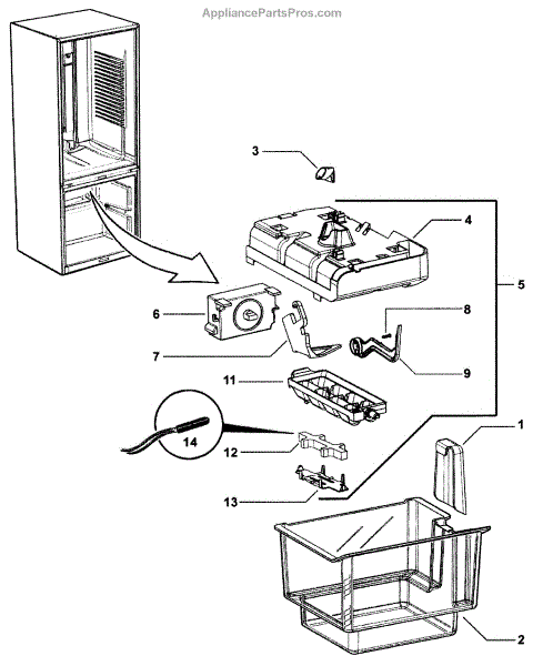 Replacement ice bin and scoop assembly that stores and produced ice and provides a convenient scoop for serving. Restores a cracked, stained, or missing ice bin so ice is contained and easy to retrieve. What it does