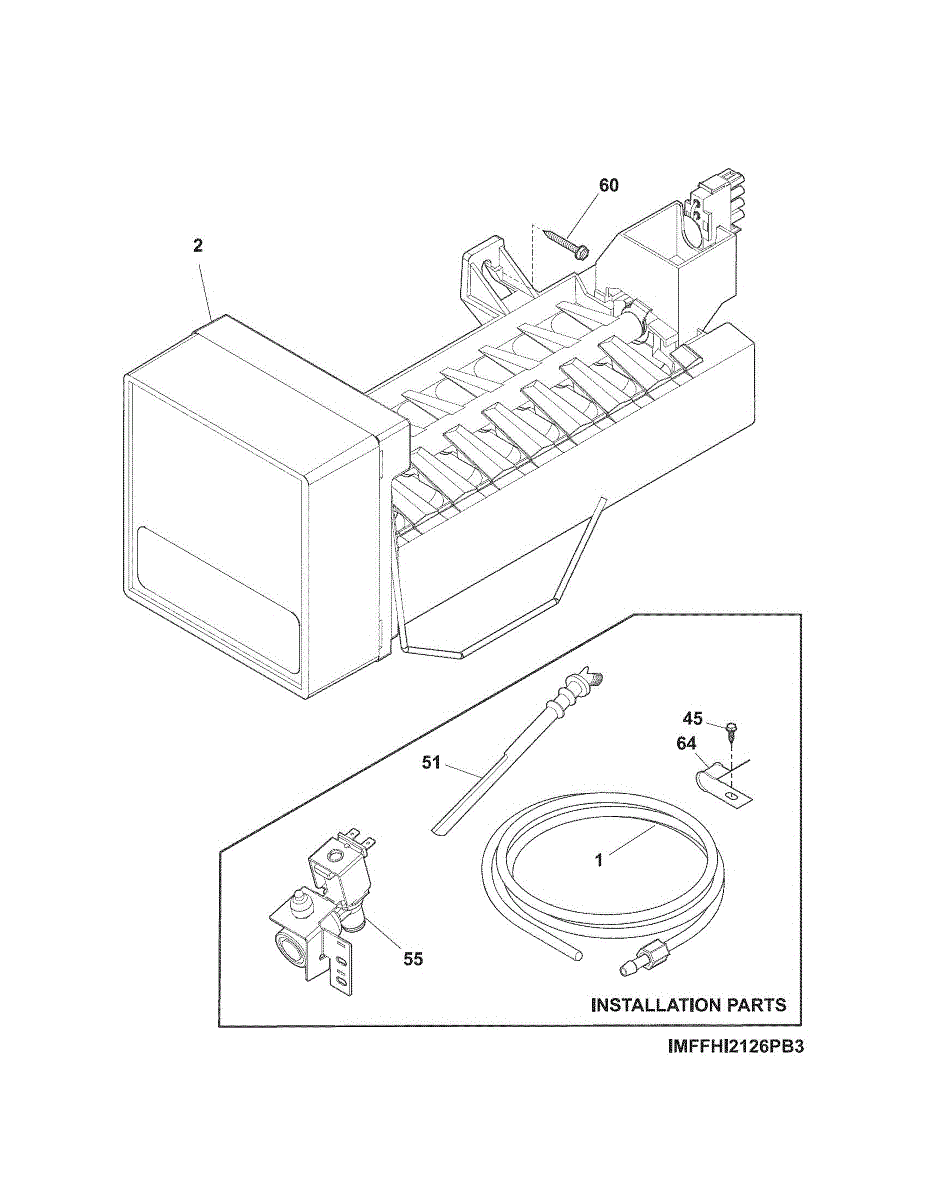 Replaces cracked, leaking, or melted ice maker fill tube that carries water from the supply line to the ice mold. Installs in the freezer compartment.