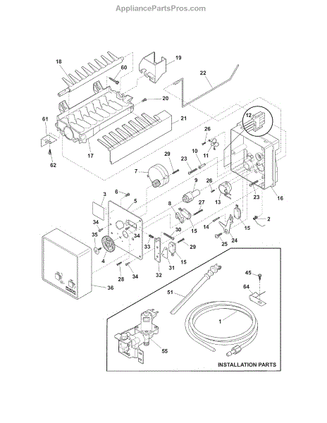 Replaces cracked, leaking, or melted ice maker fill tube that carries water from the supply line to the ice mold. Installs in the freezer compartment.