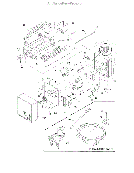 Replaces cracked, leaking, or melted ice maker fill tube that carries water from the supply line to the ice mold. Installs in the freezer compartment.