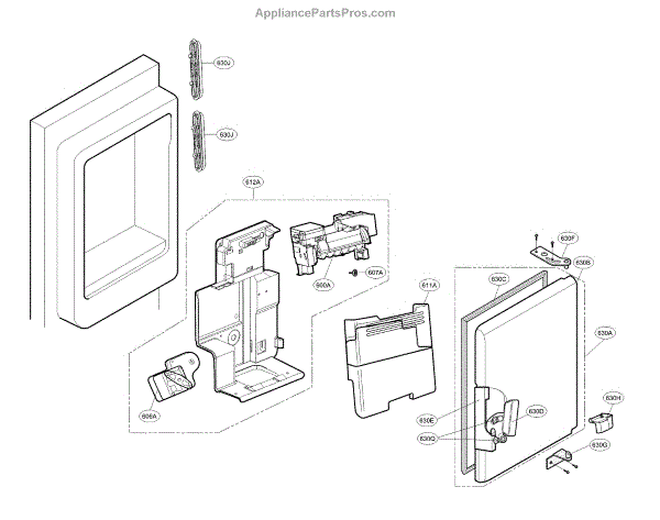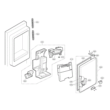 The Dispenser Ice Chute Door is an OEM part for LG side-by-side refrigerators featuring exterior ice and water dispensers. This door guides ice from the storage bin to the access port.