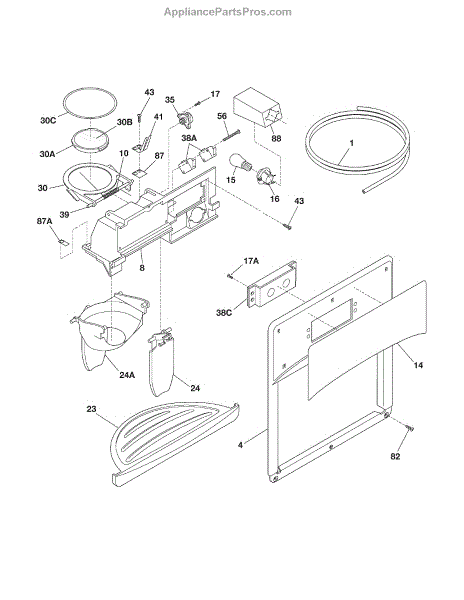 The Dispenser Module Cover is an OEM part for Frigidaire Refrigerator. It is the decorative plastic shroud that fits externally over the ice and water dispenser components.
