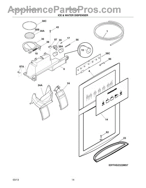 The Ice Chute Door Insulation is an OEM replacement part for Frigidaire refrigerators. It is installed on the ice chute door to prevent warm air infiltration and moisture buildup around the ice dispenser. Causes may include compression or cracking of insulating foam/material from normal use stress. Spills exposing it to liquid are also damaging. Symptoms of defective insulation consist of: