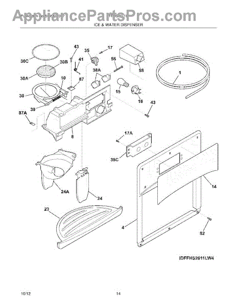 The Ice Chute Door Insulation is an OEM replacement part for Frigidaire refrigerators. It is installed on the ice chute door to prevent warm air infiltration and moisture buildup around the ice dispenser. Causes may include compression or cracking of insulating foam/material from normal use stress. Spills exposing it to liquid are also damaging. Symptoms of defective insulation consist of: