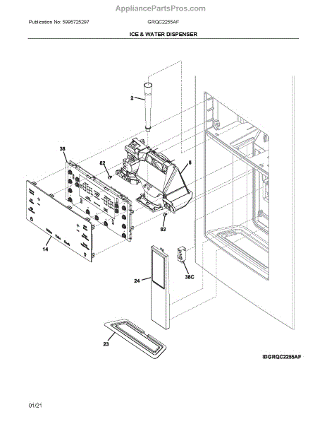 This dispenser assembly replaces the refrigerator's front dispenser unit to restore reliable water and ice dispensing and control functions. It provides the main housing and actuator interface for the dispenser area. What it does: