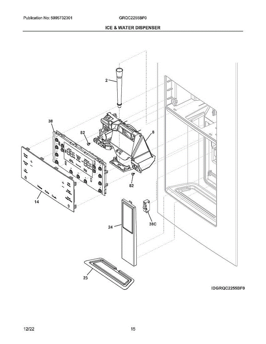 This dispenser assembly replaces the refrigerator's front dispenser unit to restore reliable water and ice dispensing and control functions. It provides the main housing and actuator interface for the dispenser area. What it does: