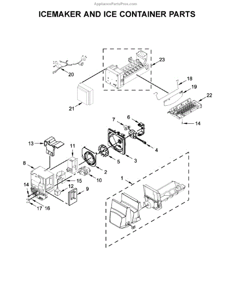 The Ice Container Assembly is an OEM component for Whirlpool refrigerators. It is the bin that collects and stores ice produced by the ice maker. With its precise design and durable construction, the ice container allows ice cubes to easily drop down through the chute from the ice maker.