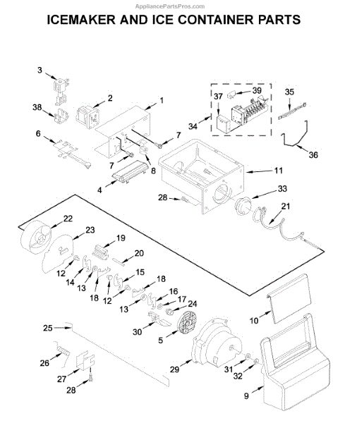 The Ice Bucket and Auger Assembly is an OEM replacement part for Whirlpool refrigerators. It includes both the ice storage bucket located in the freezer as well as the internal auger component. The auger works to periodically eject ice from the icemaker out into the conveniently accessible bucket area. Causes of a bad assembly can include wear and tear of the auger motor or gears over extended use. Damage may also occur from chewing or impact within the unit. Symptoms of a bad ice bucket and auger assembly include: